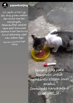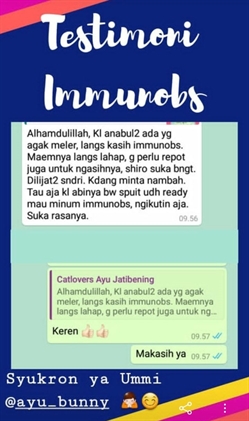 Alhamdulillah, kalau anabul ada yang agak meler langsung saya kasih immunobs. Maemnya jadi langsung lahap. Nggak perlu repot juga ngasihnya. Shiro suka banget, dijilat jilat sendiri dan kadang minta nambah. Tau aja dia, kalau Abi nya sudha bawa spuit berarti waktunya minum Immunobs. Langsung ngikutin tuh dia, suka rasanya. (Ayu - Bekasi)